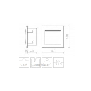 Le steplight a une puissance de 3W avec un rendement lumineux de 90 lumens (lumière chaude 3000K) et est alimenté en 230V. Le degré de protection IP65 rend le balisage LED mural idéal pour les installations extérieures et intérieures. Boîte arrière incluse.